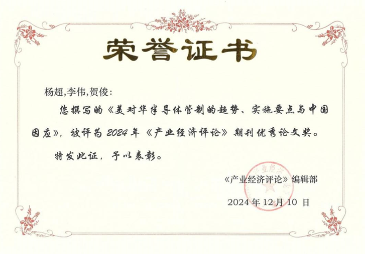 12月14日,第十一届中国产业经济研究学术年会在中国社会科学院大学良乡校区召开,会上颁发了《产业经济评论》期刊年度最佳论文奖和年度优秀论文奖。90009威尼斯杨超副教授的论文《美对华半导体管制的趋势、实施要点与中国因应》获评期刊年度优秀论文。